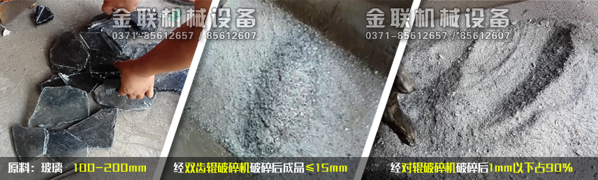 玻璃破碎效果實(shí)拍(圖片中雙齒輥破碎機(jī)采用長條齒破碎,不同的進(jìn)料和出粒要求,使用不同的齒形)